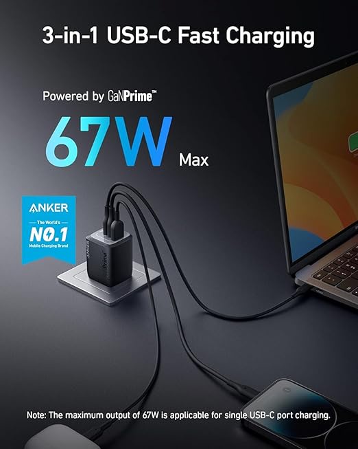 Fast Charging for 3 Devices: With 2 USB-C ports and 1 USB-A port, effortlessly charge your phone, tablet, and notebook all at once from a single charger. Connect a single device to charge up to 67W.