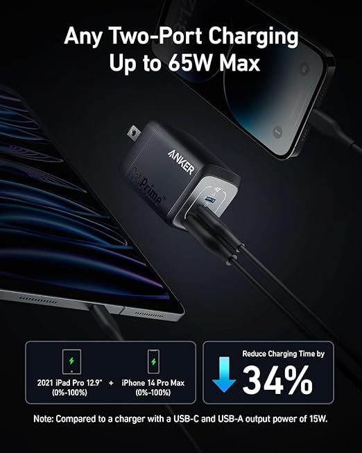 65W Max Two-Port Charging: Whether you use both USB-C ports or a combination of USB-C and USB-A ports, enjoy fast and efficient charging with a maximum output of 65W.
