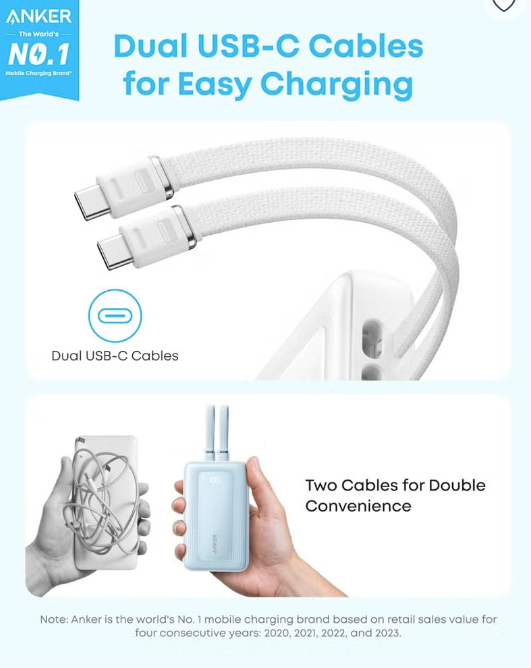 Dual Built-In USB-C Cables: Charge effortlessly with dual built-in USB-C cables. They are tested to last over 10,000 bends for long-lasting use.
