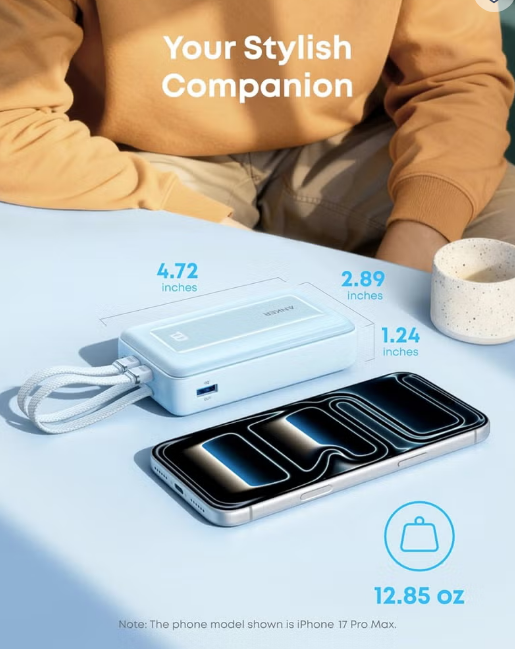 45W High-Speed Charging: Enjoy more time on the go without waiting around for your devices to charge with 45W power. Supports up to 40W fast charging for the iPhone 17 series via the built‑in cable or the USB‑C port. 45W Samsung Fast Charging is only available when using the USB-C port (not the built-in cable).