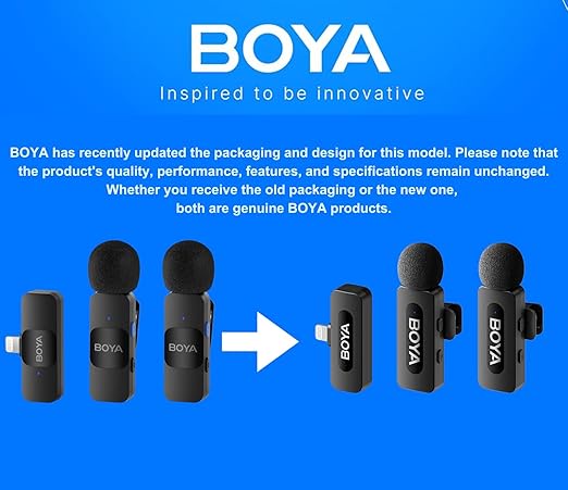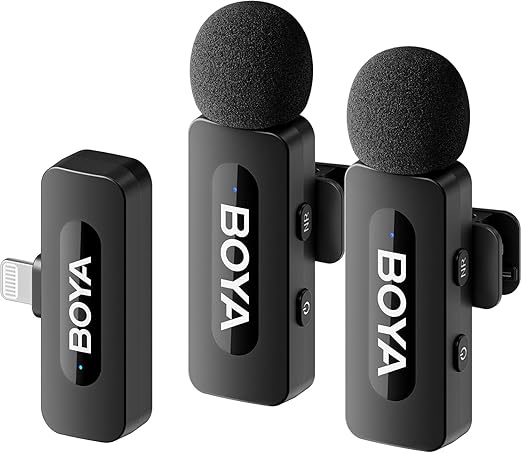 apture audio with this BOYA BY-V2 in your next single-person vlog for YouTube or Tiktok livestream with your compatible iOS mobile device . For Content Creation 2-Person Shoots with Mobile Devices 2 x Transmitters with Built-In Mic Dual-Channel Plug-In Receiver 164′ Transmission Distance USB-C Charging Ports Noise Reduction Mode, LED Indicators 9-Hour Battery Life ▶【Universal Wireless System】: The Mini Wireless clip on microphone is free of wire. You can hold it by hand or clip it on your shirt. Enable to cover 164ft/50m (without obstacle) for signal, helps you get rid of messy wire and clearly recording or taking video at a further distance indoors or outdoors.