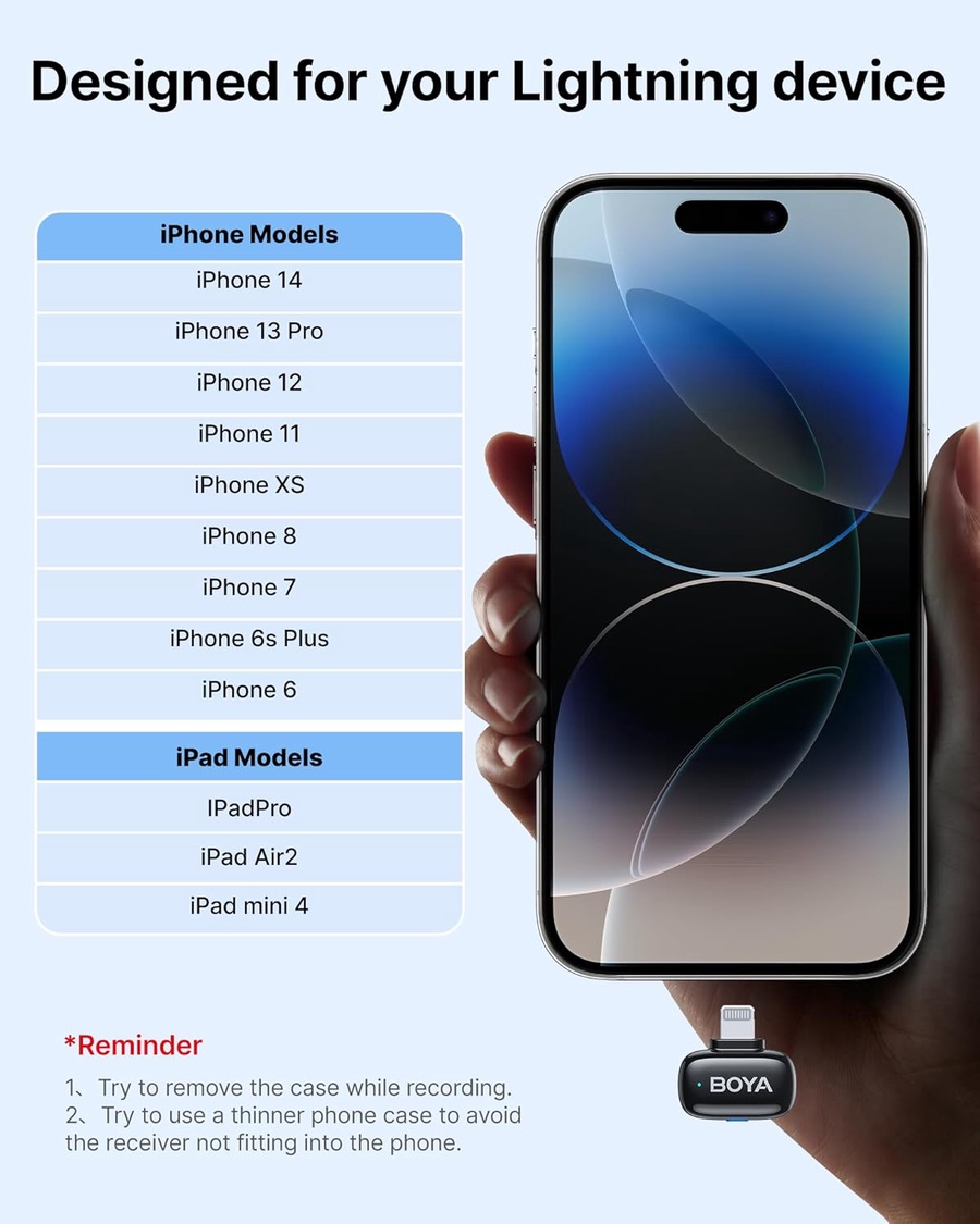 MINI BUT POWERFUL: BOYA MINI wireless lavalier microphone weighs ONLY 5 grams like a pod making it a good partner on the go. BOYA small lapel microphone is a portable wireless microphone that can be stored in a camera bag, pocket, backpack, small handbag, etc. Lossless CD-quality sound provides a professional recording device. -Upgraded 3-level AI Noise Cancellation: BOYA mini wireless microphone with a one-click button for adjusting noise reduction levels helps to cut off noise interference. With DSP noise cancellation technology ensures your voice clear in any scenario. The microphone maintains clarity at a maximum sound pressure level of 120dB, making it ideal for recording in high-pitched environments. -30 Hours Battery Life: The clip on microphone offers up to 6 hours of continuous operation. The compact charging case can recharge the entire set 1.5 times. With the charging case, the total battery life extends to 30 hours, No worry about running out of power by usage. -Automatic Pairing, 328FT Range Transmission: The wireless lavalier microphone is ready to use. Enjoy stable transmission without a signal drop, ensuring audio and video sync. When the receiver is connected to a device, the blue light will remain on, indicating it’s ready to record. You can review videos without removing the receiver, making playback hassle-free and convenient. -Innovative AI Voice Changing: The wireless microphone supports AI voice modulation. When the AI feature is activated, the indicator lights at the top of the RX will remain blue. A single blue flash switches to "Male Voice," two flashes switch to "Female Voice," and three flashes revert to the original sound. With three AI voice options, you can enjoy versatile tones and make interactions more entertaining. -Perfect for All Recording Situations: The mini microphone is perfect for a variety of recording scenarios, including short video shoots, voiceovers, lifestyle vlogs, live streaming or mukbangs, meetings and interviews, as well as online classes and singing sessions. Whether you’re sharing heartfelt stories or having fun with humor, this microphone captures every moment flawlessly.