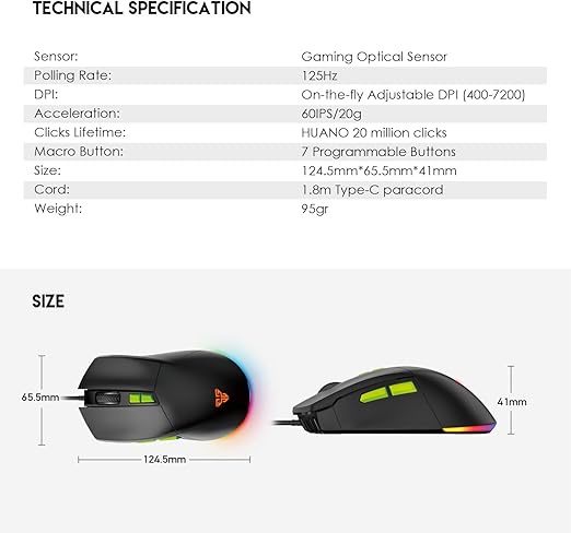 Optical Gaming Sensor Up to 60 IPS/20G Acceleration Adjustable on-the-fly DPI 400-7,200 DPI 125Hz Polling Rate