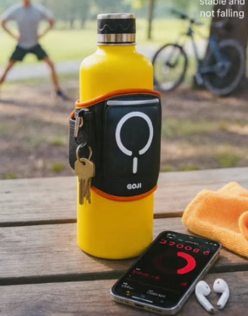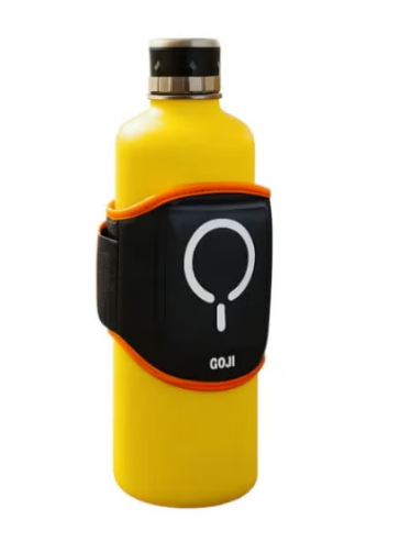 The GOJI magnetic water bottle storage bag is designed to keep your water bottle and essentials close at hand without needing to use pockets. Thanks to its magnetic closure system and sleeve The airtight bottle keeps your drink secure while walking, stretching, or cycling. The front features the GOJI logo and a spacious zippered pocket that fits a smartphone, earphones, cards, or a snack.