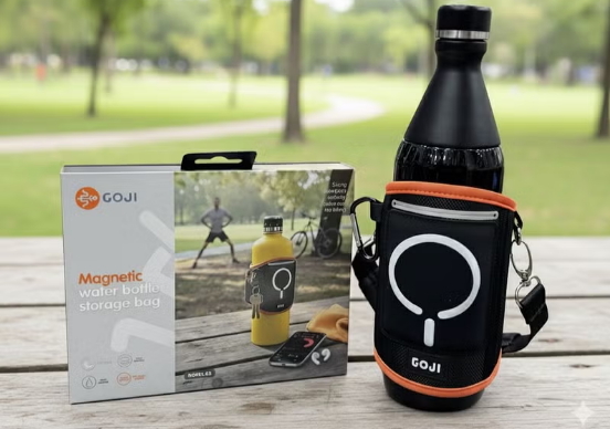 Brand: GOJI - Product Type: Magnetic Water Bottle Storage Bag - Material: Neoprene and Synthetic Fabric - Bottle Compatibility: Fits most standard water bottles and thermoses approximately 500–750 ml (depending on shape) - Closure: Magnetic closure with a secure bottle sleeve - Pockets: Front zippered pocket for phone and accessories - Additional Features: Hook/loop strap for carrying