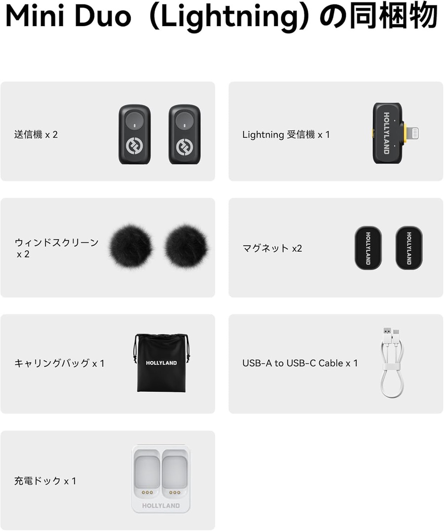 The Hollyland LARK A1 Mini Duo with Lightning Receiver is a dual-channel, digital wireless microphone system engineered for effortless iPhone connectivity and plug-and-play operation—ideal for streaming, vlogging, podcasting, and video production with two people speaking at the same time. The system includes two ultracompact, clip-on transmitters with built-in omnidirectional microphones for discreet, high-quality recording, a Lightning plug-in receiver for direct use with iOS devices, two furry windscreens for outdoor shoots, and a convenient charging dock for the transmitters.
