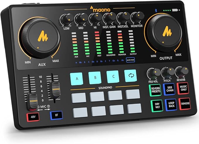 مصممة للبث المباشر: يمكنك استخدام USB-C لتوصيل جهاز الكمبيوتر أو التابلت، مخرج مباشر 1/2 لتوصيل هاتفك الذكي لتسجيل البث الصوتي والبث عبر مونيتور اس بي كيه، قم بتوصيل شاشة الاستوديو لإخراج الصوت، استخدم مقبس AUX-IN لتوصيل مرافقة الإدخال الخاصة بك من هاتف ذكي أو أجهزة أخرى، استخدم MIC1/2، وقم بتوصيل مكثف XLR / الميكروفون الديناميكي المفضل لديك. استخدم INST لتوصيل الجيتار/الباس أو الآلات الأخرى.