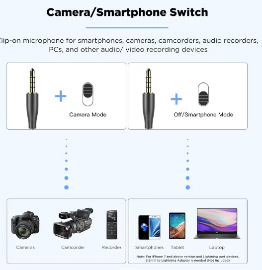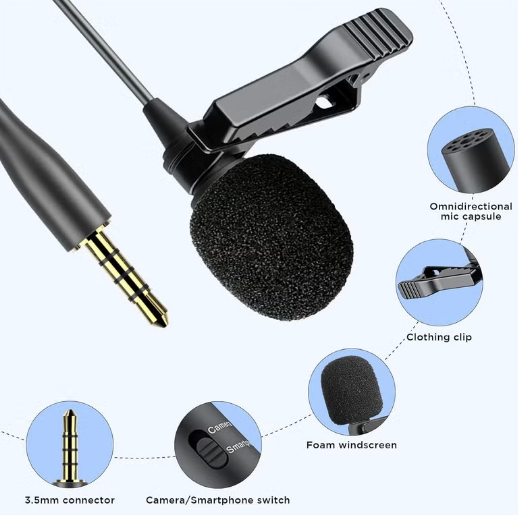 is a compact stereo lavalier microphone that clips to clothing and captures pristine broadcast-quality sound directly, video cameras, smartphones, tablets, recorders and more. - Transducer : electret condenser - polar pattern : omni-directional - frequency range : 65Hz 15KHz - signal/ noise : 74dB SPL - Output Impedance : 1000 Ohm or less - connector : 3.5mm - Accessories Included : lapel clip, LR44 battery , foam windscreen , 1/4 adapter