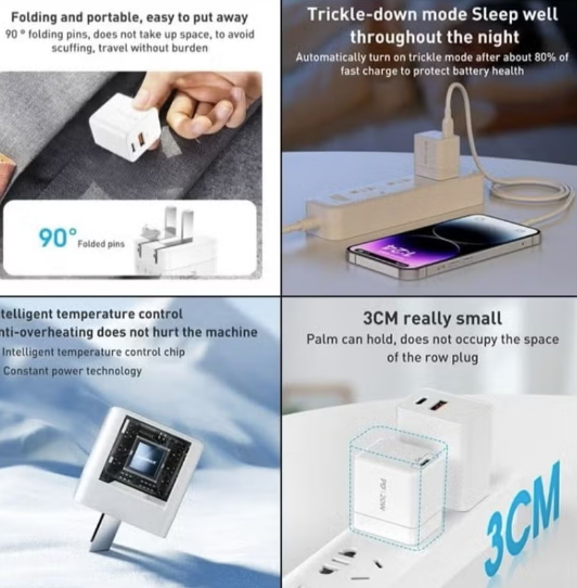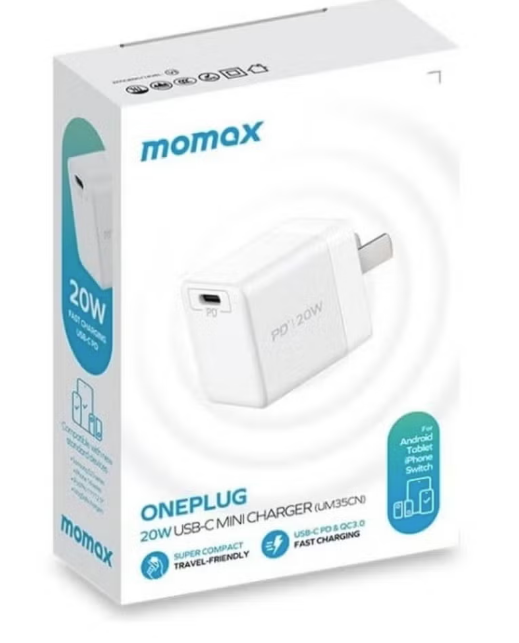 charge: iPhone12/mini/Pro/Pro Max, iPhone11/Pro/Pro Max, iPhone XS/XR/XS Max, iPhone X/8/8 Plus and other Apple notebooks and laptops that support PD fast charge and Nintendo Switch Dock QC fast charge (compatible with AFC): Samsung S21/S20 series, S10e/S10+, S9/S9+, S8/S8+, Note10 series, Note9, Note8, Note7 and Xiaomi, Meizu and other brands of mobile phones and tablets Huawei FCP fast charge: P40 series, P30 series, Mate30 series, Mate20 series, P20/20Pro, P10/10Plus, Mate10/10Pro, Mate9/9Pro, Honor V20, etc. PPS fast charging: Samsung S21, Samsung Note10, Xiaomi Notebook Air 13.3, Huawei MateBook, etc.Product parameters: 1. Model: UM26CM 2. Input: AC 100-240V 0.8A 3. USB-C output: 5V/3A, 9V/3A, 12V/2.5A, 15V/2A, 20V/1.5A 4. Total output: 30W (max) 5. Interface: USB-C 6. Material: PC+ABS 7. Dimensions: 52.9×39.8x28mm 8. Weight: 65g 9. Color: white