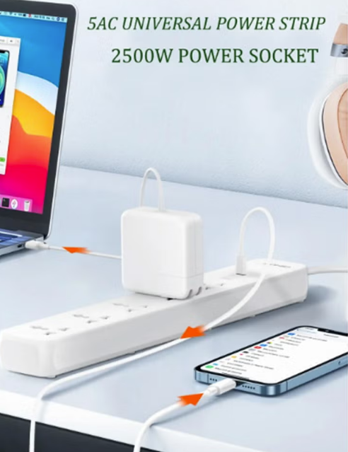 Universal Compatibility: Equipped with 5 AC outlets, 2 USB-A ports, and 1 USB-C port, this power strip provides versatile charging options for various devices including smartphones, tablets, laptops, and more.