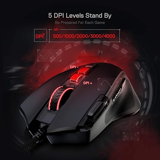 Pentakill, 5 DPI Levels - Geared with 5 redefinable DPI levels (default as: 500/1000/2000/3000/4000), easy to switch between different game needs. Dedicated demand of DPI options between 500-8000 is also available to be processed by software.