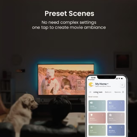 One-tap scene: Designed with preset scenes that can be activated without any additional settings. You can also set the light configurations as you like and click "Save current status" to save the current configuration as a new setting for sleeping, reading, morning, parties and much more.