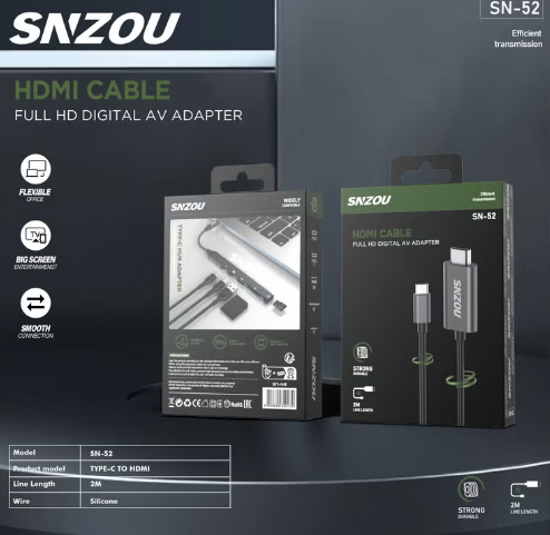 The SN-52 HDMI Cable Delivers High-Definition Video and Audio Transmission from Type-C Devices to HDMI-Compatible Displays. With a durable and strong build, this 2-meter cable ensures efficient signal transmission and a stable connection.