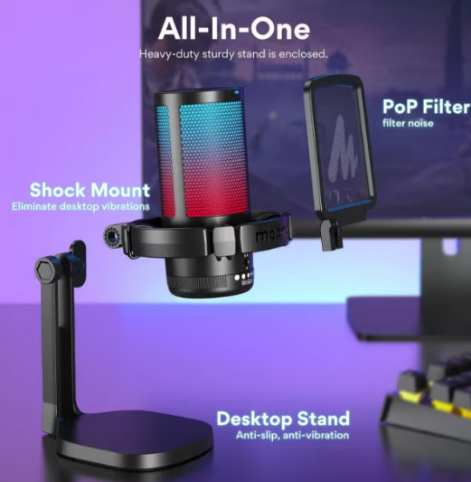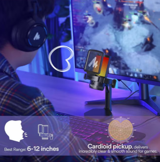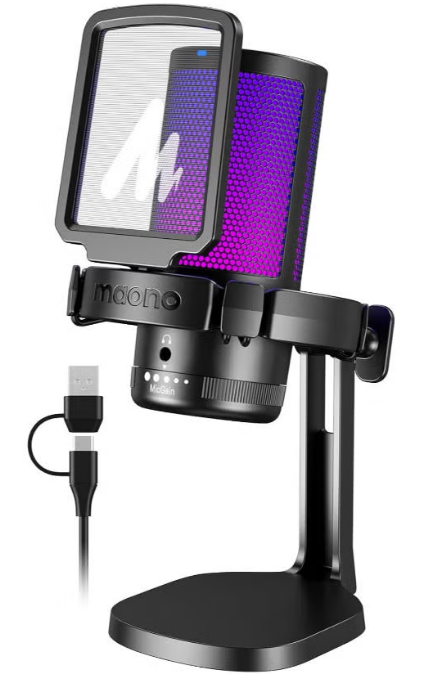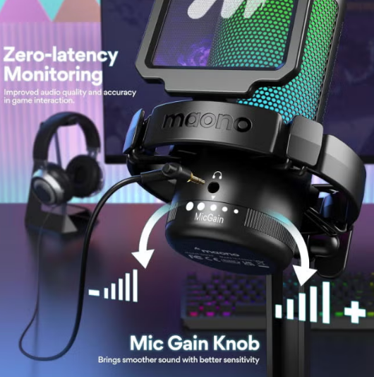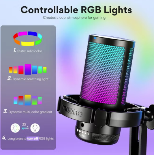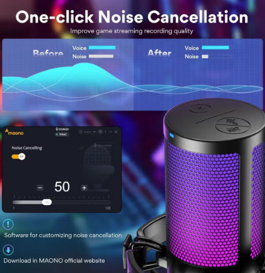 MAONO GLOBAL BEST-SELLING INTERNET MICROPHONE GAMERWAVE USB Microphone DGM20 GAMERWAVE is an all-in-one easy plug & play USB microphone that is designed for game enthusiasts. Based on a high sampling rate and adding ENC technology, which can bring a game voice-live experience for users. NET game scenes are compatible with interlink virtual and reality; Simplicity, portability, and versatility of multiple RGB lighting. THREE COLOR FOR YOUR OPTIONS New Generation of InternetMicrophone If you have tried the sound of DGM20 GAMERWAVE, you will be pleasantly surprised by its' price and sound. Is there any game player who would not like the thrill of enjoying the game under RGB lighting and an environment without interruption? Maono has always been ranked first in the list of USB microphones and as the global best-selling microphone brand, The efficacy, and sound feel of the DGM20 GAMERWAVE microphone will never upset you. Gamer's Perfect Choice USB/USB-C Connectivities Plug-and-play when recording on a desktop or laptop by plugging the USB cable directly. Strong output, no distortion, low power consumption. High Sensitivity Cardioid Pickup Cardioid pickup shows excellent off-axis sound suppression capability of reducing the sound pickup from the side and rear, thus eliminating background noise. One-tap Noise Reduction With ENC tech, anti-plosive and stereo capabilities, crisp & accurate sound reproduction. truly realize noise cancelling and collect voice clearly. RGB Ambient Light That Can Be Turned Off The RGB blends into whatsoever lighting setup for having multiple patterns to choose from. which enables you to change modes anytime you like and truly immerse yourself in real game scenes. Zero Latency Monitoring in USB Mode Equipped with a headphone jack for zero-latency monitoring. You can monitor your own voice in real-time through headphones, allowing you to record more freely! And there's a Mic gain knob under the microphone also easy to control the volume yourself. Quite A Choice For Gamers All in one microphone set equipped with pop filter and shock mount, DGM20 GAMERWAVE USB condenser microphone is specially designed for games, live broadcasts, The RGB ambient ligth that can be turned off anytime. Go to slide 1Go to slide 2 PACKAGE LIST DGM20 GAMERWAVE (with stand vesion): Includes USB gaming microphone x1, stand x1, pop filter x1, shock mount x1, USB-C to USB-A/USB-C cable x1, user manual x1, arm stand adapter x1. The pc mic can fit 5/8 inch threaded setups. DGM20S (with boom arm vesion): Includes USB gaming microphone x1, pop filter x1, shock mount x1, USB-C to USB-A/USB-C cable x1, boom armx1,user manual x1, arm stand adapter x1. The pc mic can fit 5/8 inch threaded setups. SPECIFICATIONS Element Type Condenser Microphone Polar Pattern Cardioid Connectivity USB/USB-C Bit Depth/Sample Rate: 48kHz/24Bit Frequency Response 50Hz-20kHz Monitoring Function ✔ Flexibility -3dBFS ±3dB(Max Gain) SNR 73dB Compatible Devices Desktop/Laptop/Computer/PS4/PS5/MAC OS/WINDOWS Noise Deduction ✔ RGB Light Mode 9 Kinds of Modes Recommended Uses For Product Podcasting, Recording, Streaming, Gaming, Video Conference