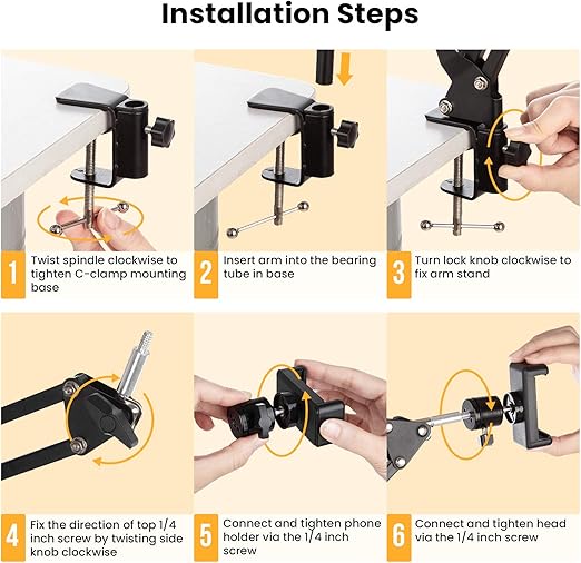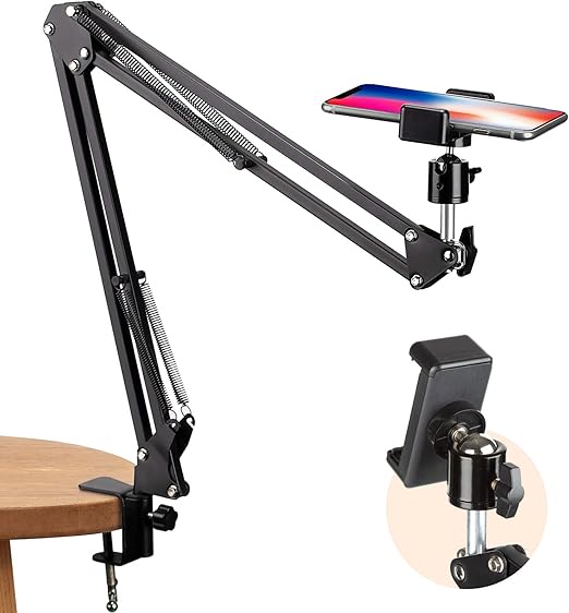 Overhead Phone Video Stand - Phone suspensiopn stand scissor arm comes with phone clip and ball head camera mount fitting well cell phone, video, live stream, baking, crafting and other devices with 1/4 threading hole. Scissor Arm Phone Mount- Double-braced arms with suspension springs on each boom arm more sturdy and durable without shaking or dropping; the flexible scissor arms with adjustable screws allow you adjust to any position and height to show image. 1/4” standard screw hole phone clip holder with sponge mat and serrated anti-slip rubber pad prevent your cell phone from tilting and falling. 1/4” head ball with 360 degree rotation provides your different angles. You can adjust the ball head to meet your need easily. Table mounting clamp has rubber pad to protect your desktop from scratches. With adjusting positioning screw, the desk clamp can clip to any table up to 1.8” thickness.