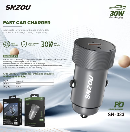 The SN-333 Fast Car Charger is designed with Power Delivery (PD) for 30W fast charging. With overcharge protection and universal compatibility, it ensures safe and efficient charging in any vehicle.